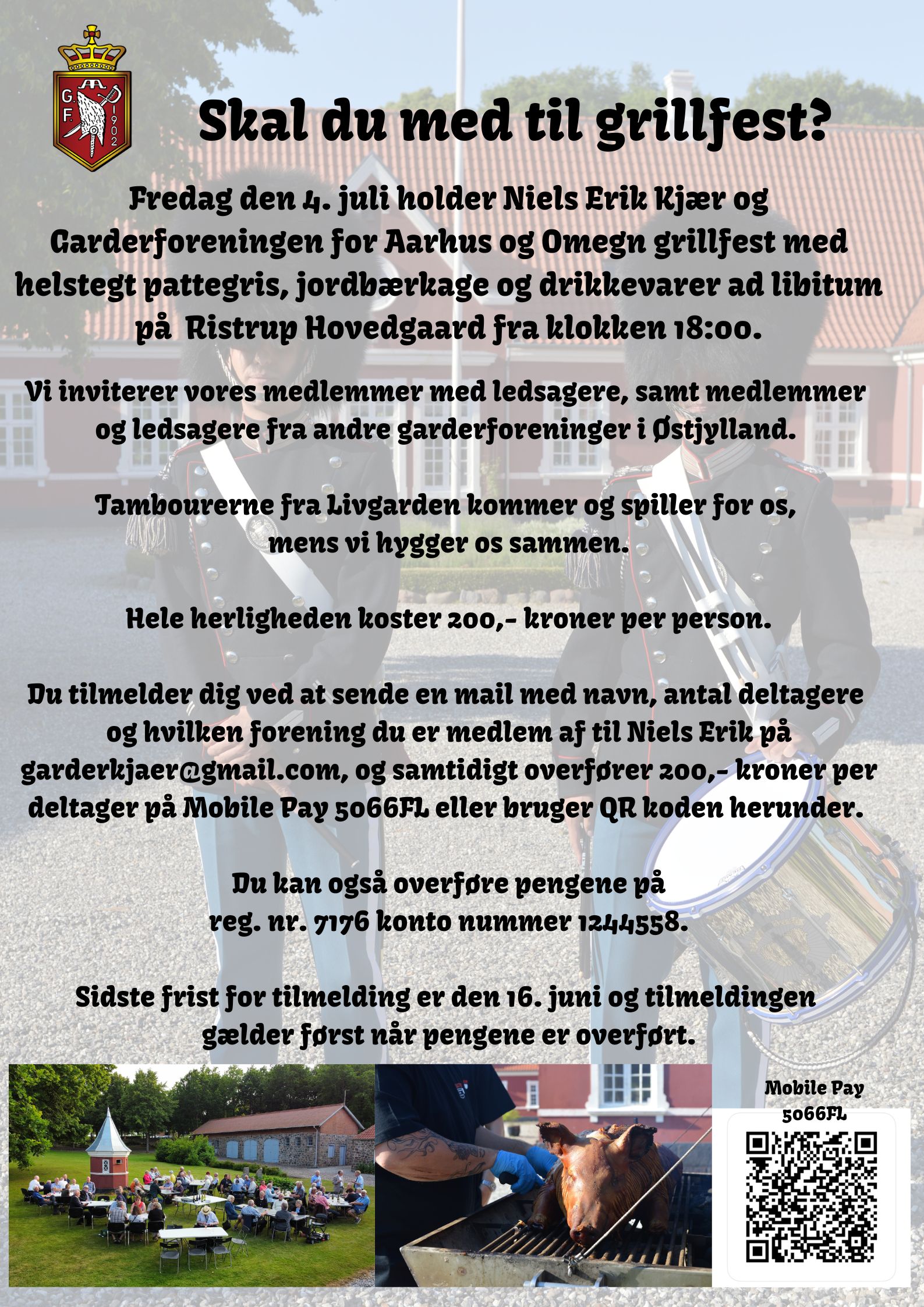Det er Niels Erik, der står for arrangementet, derfor skal du også melde dig til hos ham på garderkjaer@gmail.com og overføre de 200,- Per person på Mobile Pay 5066FL.